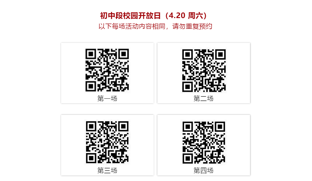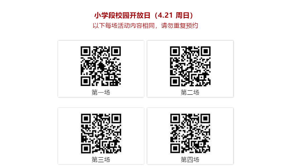 活动安排 本次校园开放日活动每天共设四场: 第一场:08:10 - 10:40 第二场:09:20 - 11:50 第三场:12:20 - 14:50 第四场:13:20 - 16:00 活动要求 1.活动当天请家长持入校凭证 (手机截图) ,按照预约场次分批入校参加活动; 2.学生无需携带纸笔及其他文具入场; 3. 由于开放日活动及场地限制,每位学生仅限一位家长陪同; 4.建议家长绿色出行,如开车请停在学校周边,注意安全。